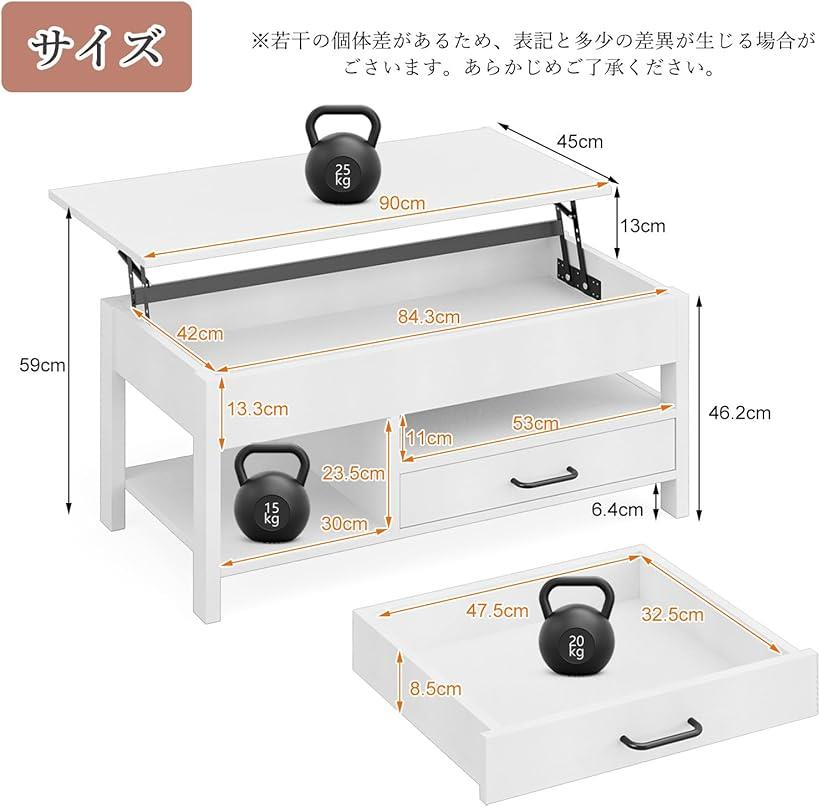 ローテーブル 昇降式 木製 コーヒーテーブル 引き出し付き 収納付き センターテーブル 大容量収納リビングテーブル 高さ調整リフティングテーブル コンパクト リビングルーム オフィス用 ホワイト |