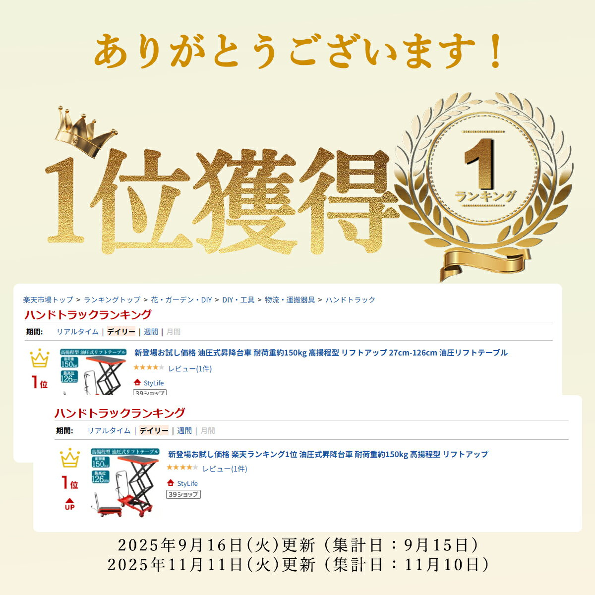 新登場お試し価格 楽天ランキング1位 油圧式昇降台車 耐荷重約150kg 高揚程型 リフトアップ 27cm-126cm 油圧リフトテーブル リフトカート テーブルカート ハンドリフター 昇降台車 台車 ゴムシート付 リフティングテーブル 運搬台車 台車 赤 |