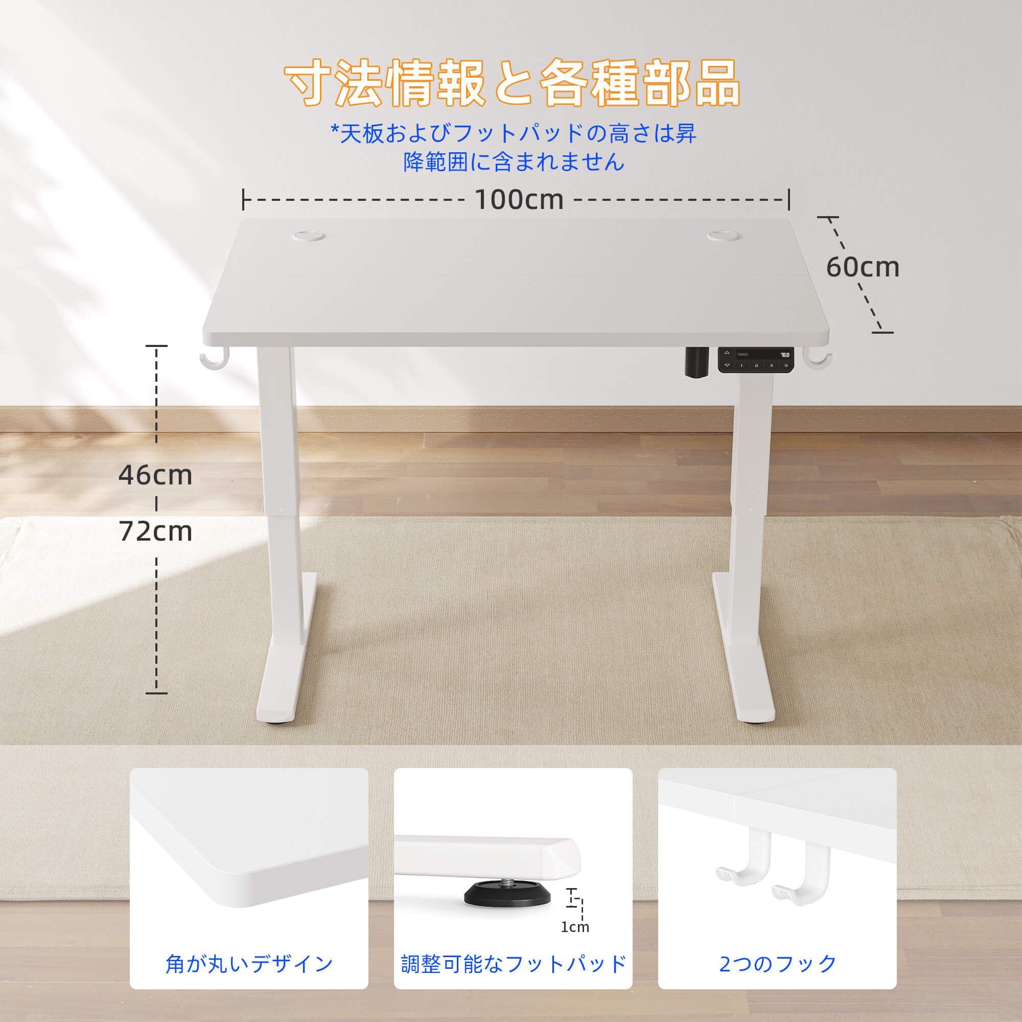 YIHAYO ローデスク 高さ46-72cm 昇降デスク 幅100cm 奥行き60cm 電動 ゲーミングデスク 昇降式デスク 高さメモリー機能 静音 収納フック付き 組み立て簡単 ローテーブル (ホワイト) |