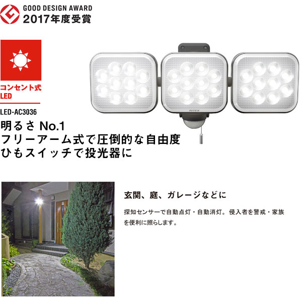 RITEX ムサシ LEDセンサーライト 12W×3灯 フリーアーム式 LED-AC3036 人感センサー 屋内 屋外 防水 コンセント式 防犯 ライテックス 「送料無料」 |