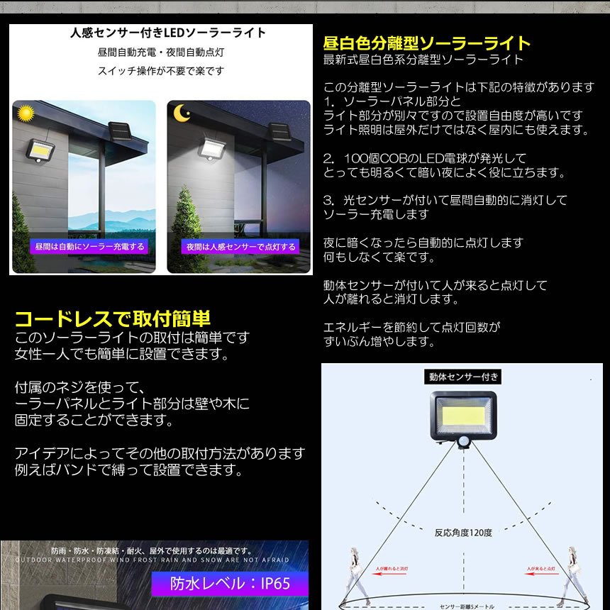 ソーラーライト センサーライト 分離型 5Mコード 防犯 防災 COB型 100LED 屋外 玄関 駐車場 庭 自動点灯 tec-sepalight05 |