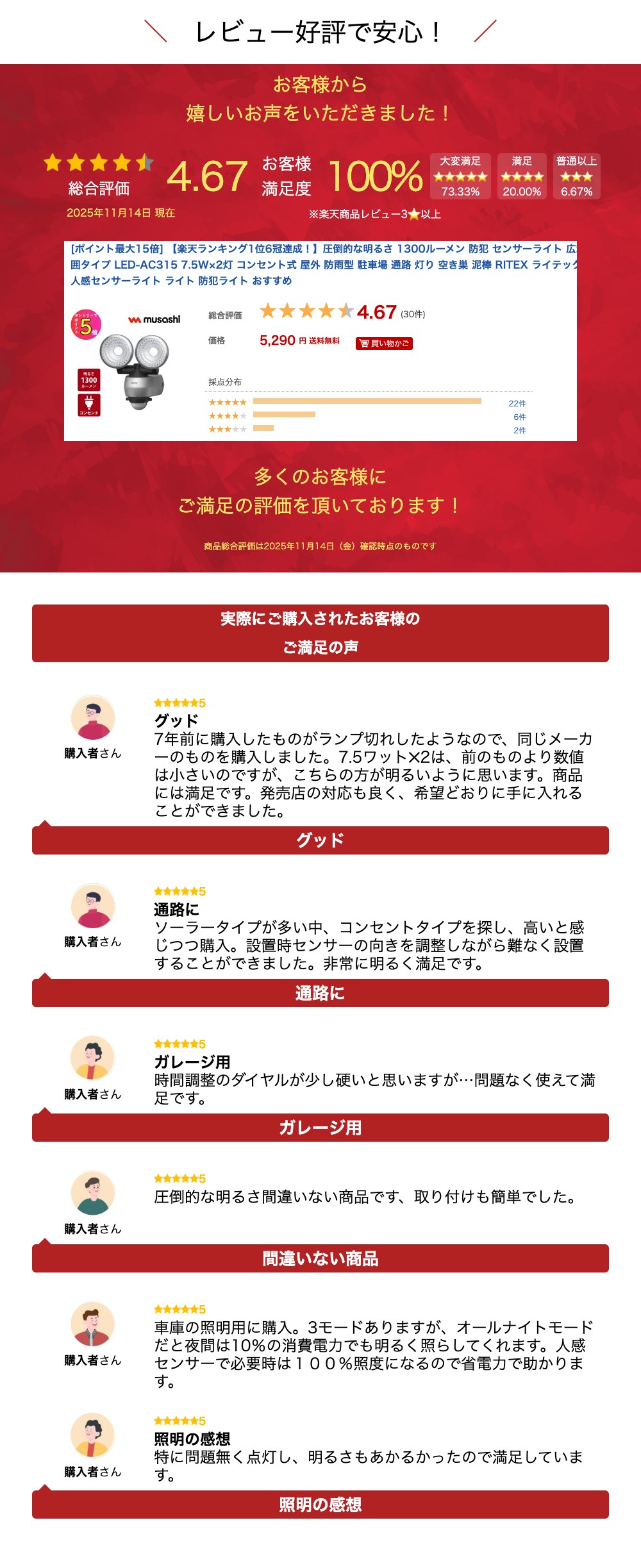 [ポイント最大15倍] 【楽天ランキング1位6冠達成!】圧倒的な明るさ 1300ルーメン 防犯 センサーライト 広範囲タイプ LED-AC315 7.5W×2灯 コンセント式 屋外 防雨型 駐車場 通路 灯り 空き巣 泥棒 RITEX ライテックス 人感センサーライト ライト 防犯ライト おすすめ |