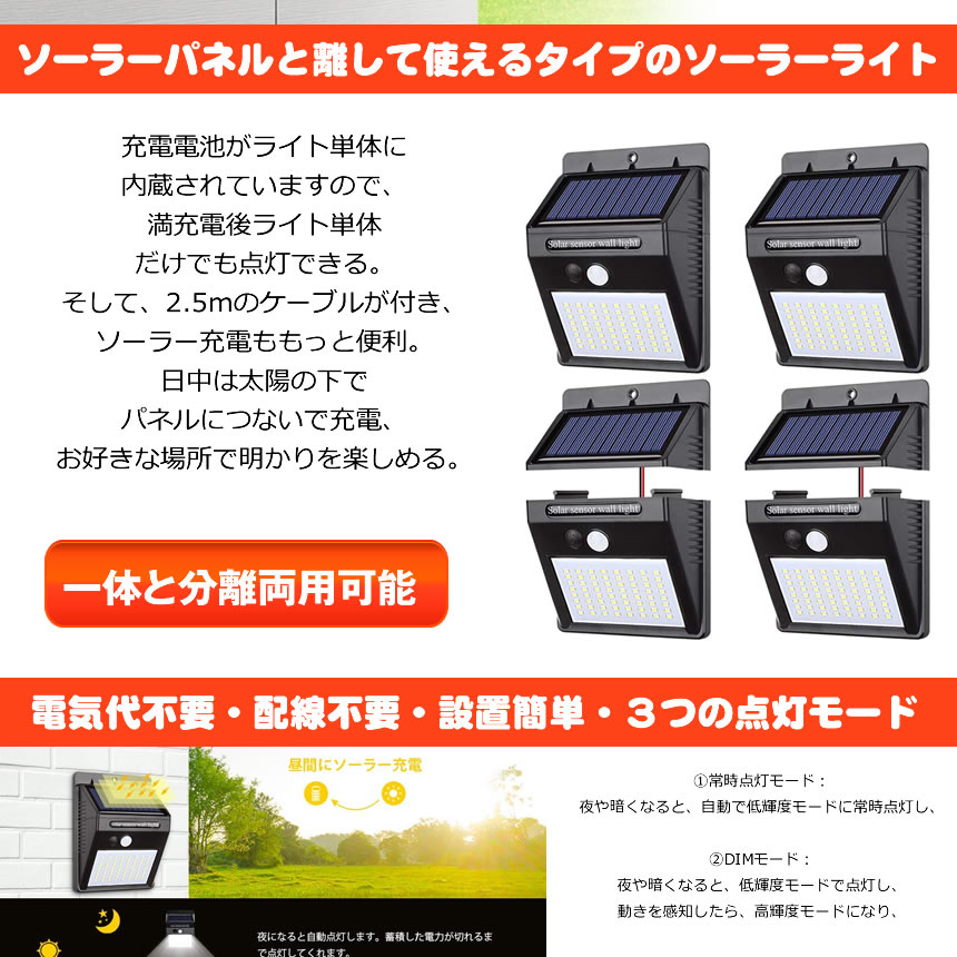 【 2個 セット 】 ソーラーライト 屋外 防水 ソーラー センサー LED センサーライト 人感センサーライト 分離型 人感 防犯ライト 64LED ライト 照明 パネル分離 太陽光発電 防犯 玄関 庭 取付簡単 駐車場 玄関 軒先 |