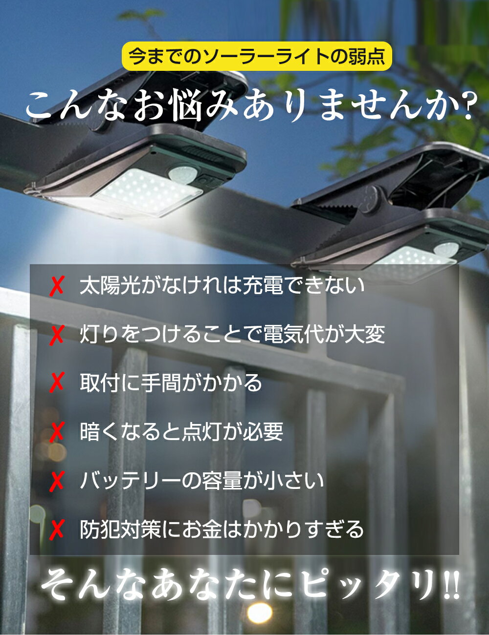 \先着50名★半額クーポンで2980円/センサーライト クリップ 屋外用 ソーラー クリップ式 センサー ライト 人感センサー ソーラーライト 屋外 防水 LED 大きい おしゃれ USB充電とクリップ付き 4モード搭載 昼白色 電球色 庭 ガレージ 駐車場 壁面 フェンス 防犯対策 |
