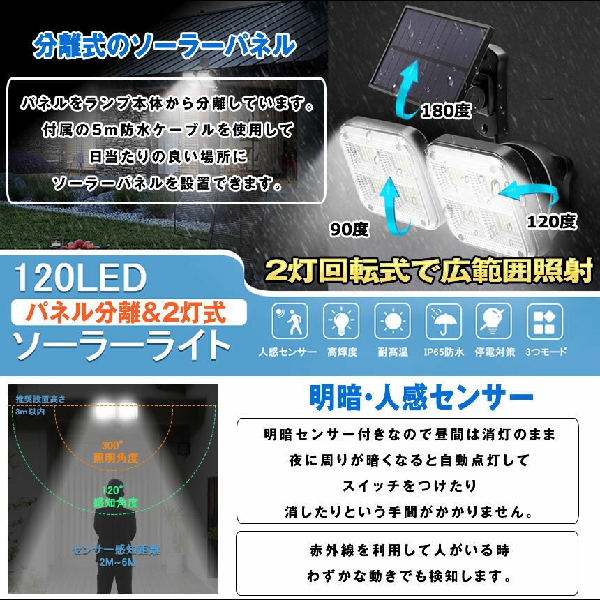 ソーラーライト 120LED 4個セット 2灯式 5mコード付き センサーライト 防犯ライト ガーデンライト アウトドア ソーラーフラッドライト モーションセンサー付き キュリティライト 照明 IP65防水 防犯 人感 防水 屋外照明 太陽光発電 アウトドア 庭 玄関 駐車場 通路 |