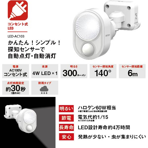 ムサシ RITEX LED センサーライト コンセント式 屋外 4Wx1灯 LED-AC103 防水 100V 小型 人感センサー 防犯 ac ライテックス 「送料無料」 |