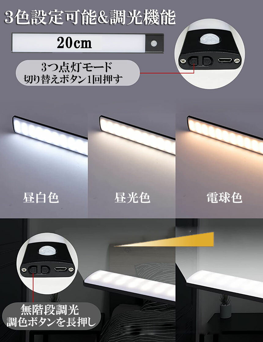 LEDセンサーライト 人感センサーライト キッチンライト フットライト LEDバーライト 色温度/明るさ調整可能 20cm 3段階調色 電球色 昼白色 昼光色 超薄型設計 非接触 USB充電式 ケーブル付き 卓上LEDライト 無段階調光 手元灯 流し元灯 台所 棚下 間接照明 工事不要 |