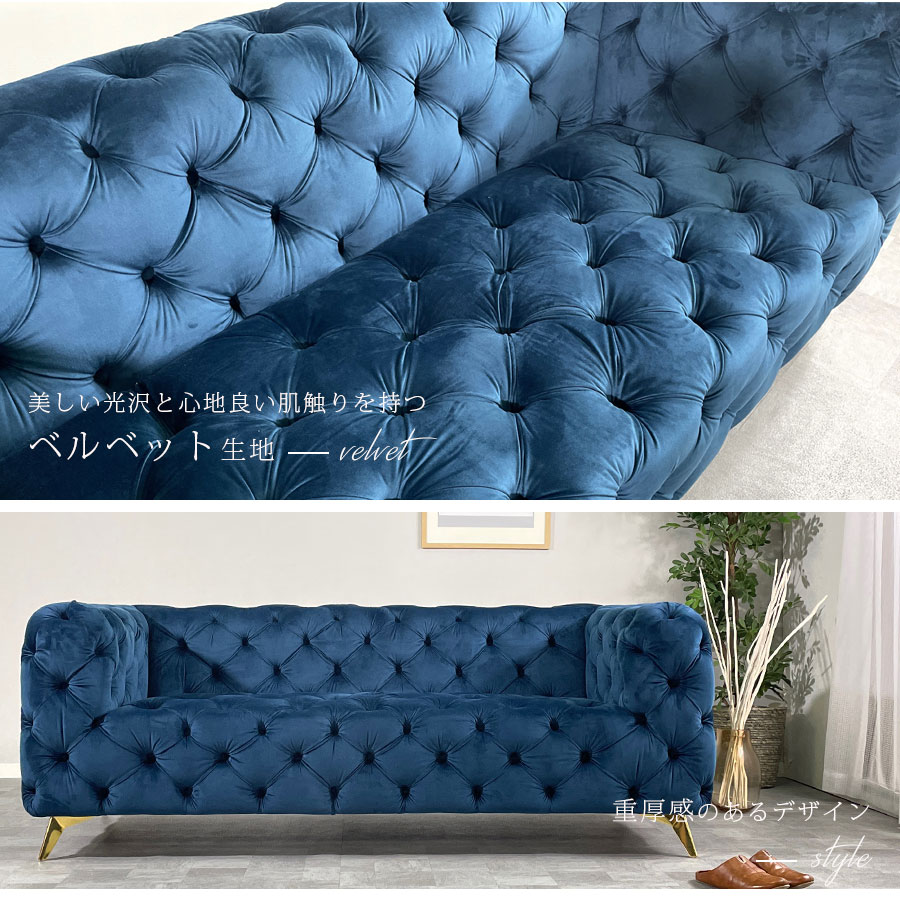 15%offクーポン配布中 ソファ 3人掛けソファ 3Pソファ おしゃれ 英国調 ベルベット生地 ボタンダウン チェスターフィールド 脚付き 3人用 モダン スタイリッシュ ブルー グレー |