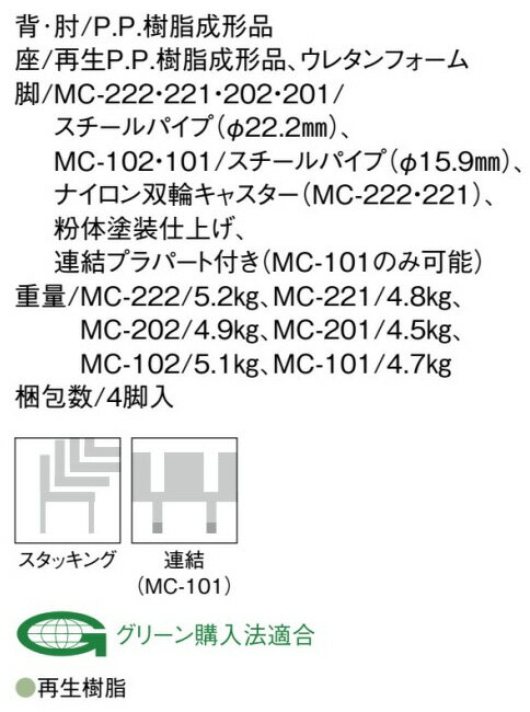 【 法人様限定 】 アイコ 会議チェア 粉体塗装タイプ ループ脚タイプ グレーシェル 肘なし MC-101G 計4脚セット 【 選べる座面の張地カラー 全11色 】 【 連結可能 】 スタッキングチェア ミーティングチェア |