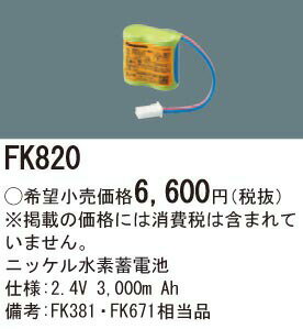 パナソニック FK820 誘導灯・非常用照明器具交換電池 ニッケル水素蓄電池 仕様;2.4V 3,000m Ah |