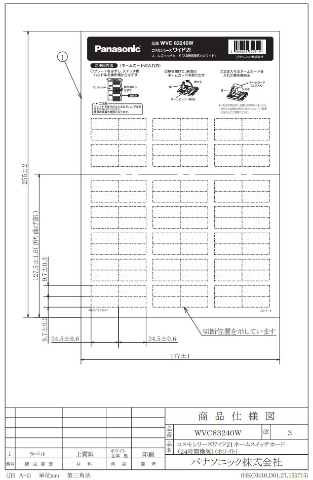 パナソニック コスモシリーズワイド21 ネームスイッチカード 表示:24時間換気 ホワイト WVC83240W |