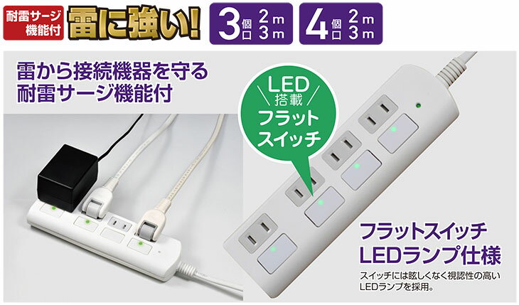 ELPA 耐雷フラットスイッチ付タップ 扉付 3P 3m ホワイト WBSLS303FW |