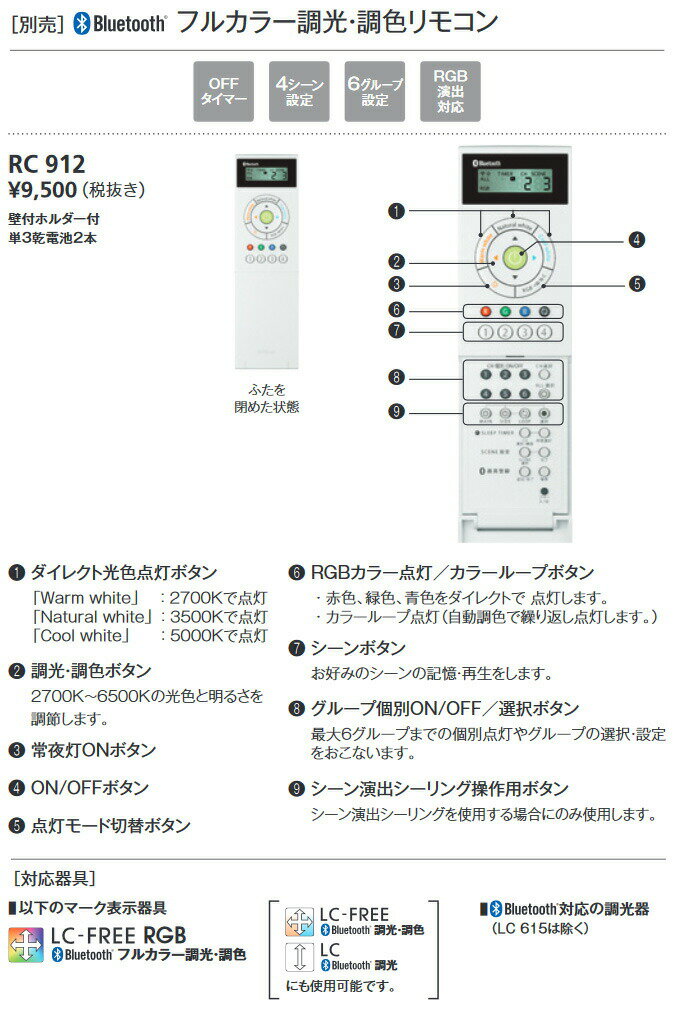 ODELIC CONNECTED LIGHTING専用コントローラー フルカラー調光・調色リモコン送信器 6グループ設定 RC912 |