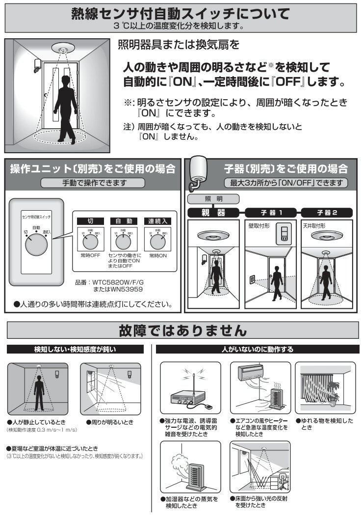 パナソニック 天井取付熱線センサ付自動スイッチ 4線式 多箇所検知形 親器 蛍白両用 直径85mm 埋込穴φ70mm セード付 屋内用 明るさセンサ・手動スイッチ付 3A 100V AC ホワイト WTK24111K |