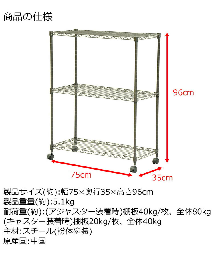 スチールラック キャスター付き 3段 幅75cm 高さ96cm 収納 収納家具 リビング収納 本棚 ラック シェルフ ディスプレイラック 収納棚 キッチン収納 レンジラック オープンラック(代引不可)【送料無料】 |