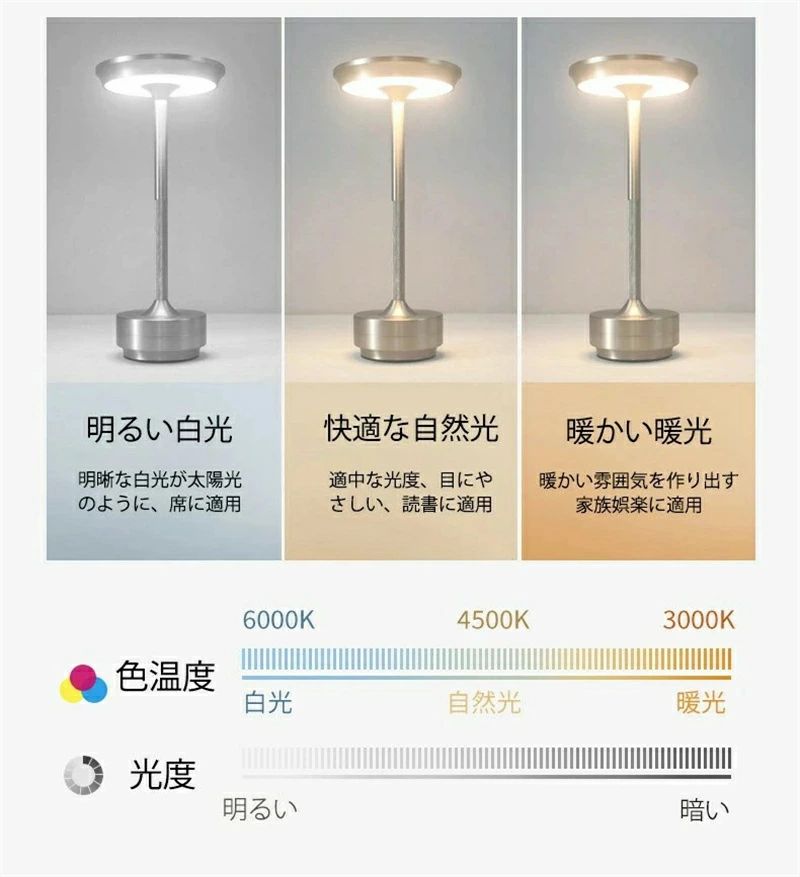 テーブルランプ コードレス USB充電式 Type-C ベッドサイド 省エネ 無段階調光+3段階明るさ 間接照明 夜間ライト ナイトスタンド 勉強ライト 金属 アルミニウム モダン レストラン 寝室 |
